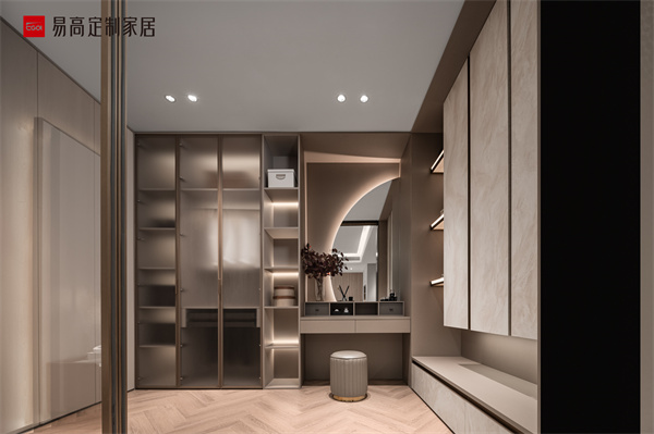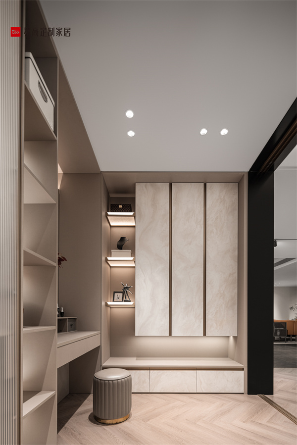 整體設計恢弘大氣,用自然紋理和皮質軟包的碰撞演繹奢雅生活美學,時尚內斂,詮釋高階生活品質。衣帽間步入見美,異形幾何元素和光影巧妙聯動,典雅不凡的氣質呼之欲出,精致格調愉悅身心。